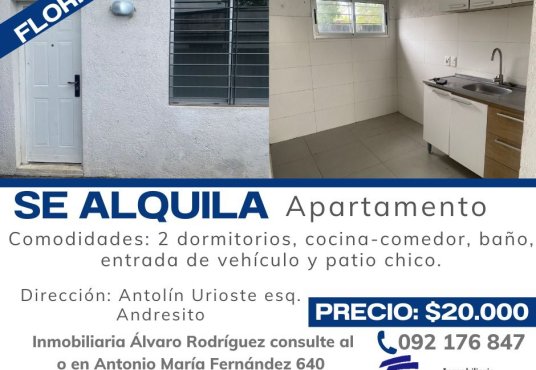 $ 20.000Se alquila apartamento Comodidades: 2 Dormitorios, cocina-comedor, baño, patio chico y entrada para vehículo compartida Precio: $20.000