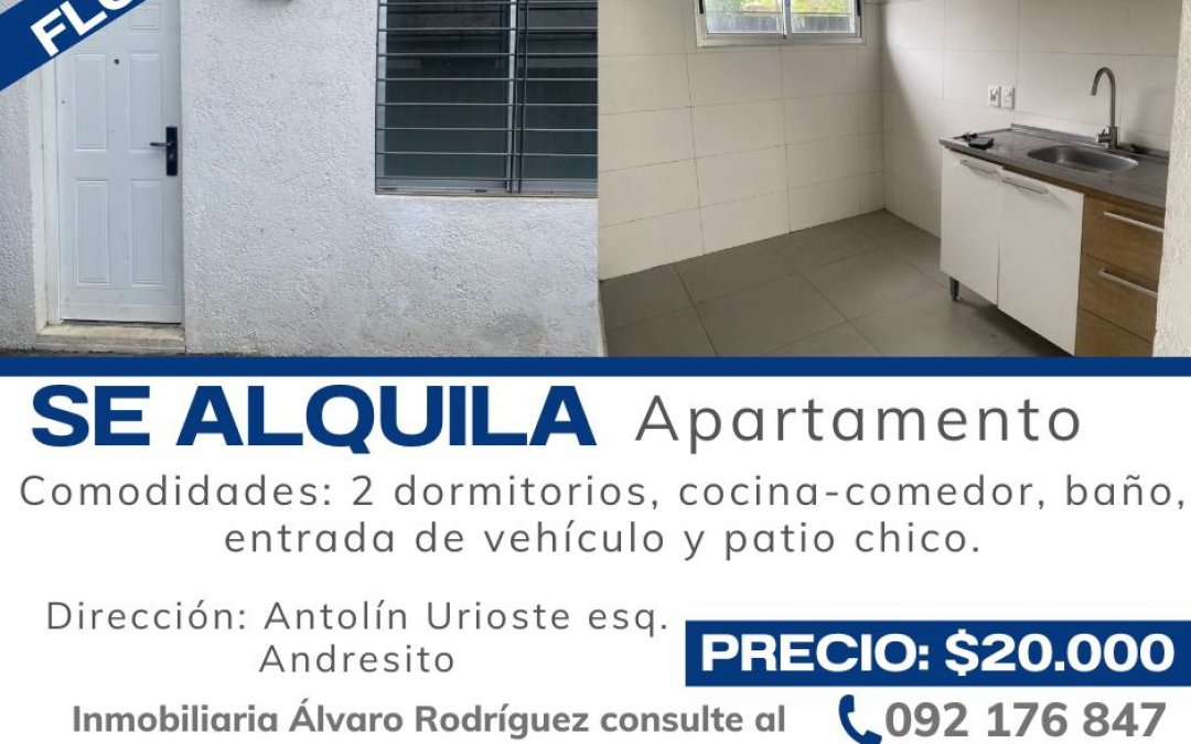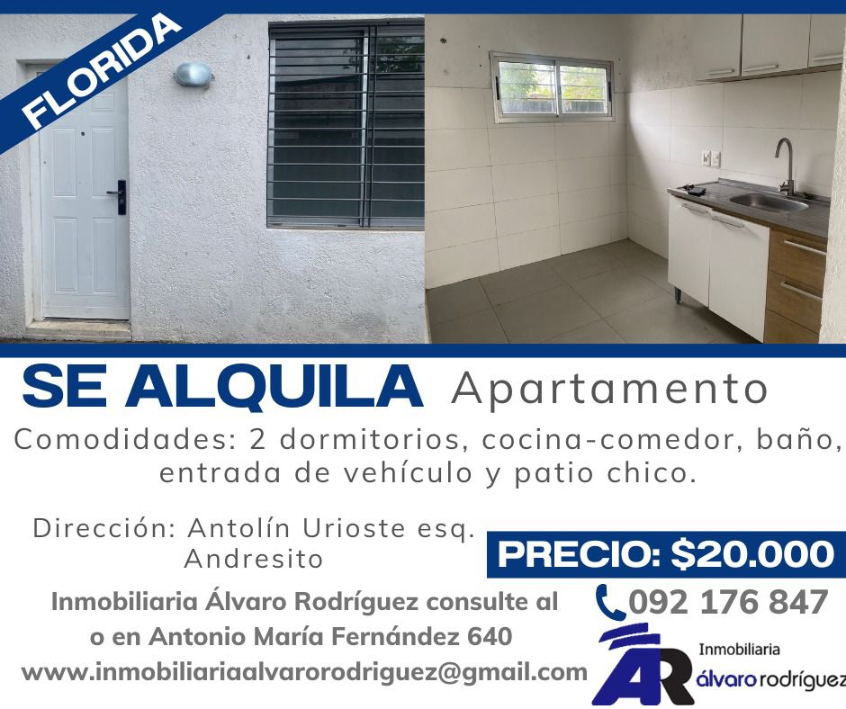 Se alquila apartamento Ene 13, 2026 En alquiler $ 20.000 $ Hechos básicos Descripción Barrio Características Video Agente 1 2 Publicación: 01/13/26 Dormitorios: 2 Baños: 1 Estado: Buen estado Tipo: APARTAMENTOS Código: 94000 Ciudad: Florida Departamento: Florida Moneda: Pesos Uruguayos Descripción Se alquila apartamento Comodidades: 2 Dormitorios, cocina-comedor, baño, patio chico y entrada para vehículo compartida Precio: $20.000 Ir arriba
