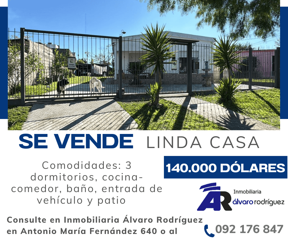 Comodidades: 3 dormitorios, 1 baño, cocina-comedor, entrada de vehículo, garaje y patio