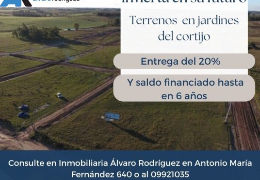 $ 19.454Se venden TERRENOS EN JARDINES DEL CORTIJO TERRENOS CON FINANCIACIÓN Precios desde USD 23.000 Entrega el 20% y financia el resto hasta en 6 años Además, contamos con una financiación hasta en 36 cuotas SIN INTERESES Consulte: Inmobiliaria Álvaro Rodríguez Dirección: Antonio María Fernández 640 bis Teléfonos: 092176847 o 099210351